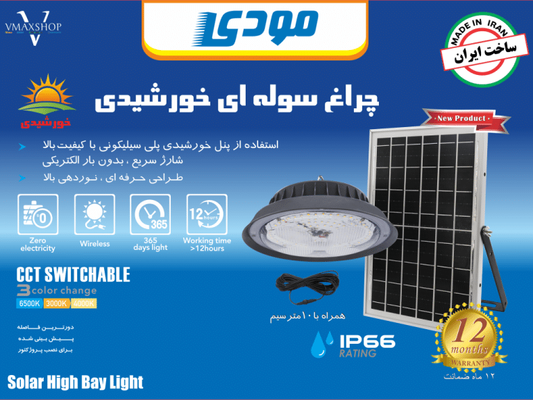 چراغ آویز خورشیدی SMD مودی 400 وات MD74400چراغ آویز سولار به جای استفاده از برق شهری، با پنل یا صفحه خورشیدی شارژ میشود. پنل این چراغ ها در روز شارژ میشود و در شب انرژی لازم این چراغ ها را تامین میکند. چراغ سوله ای خورشیدی مناسب کارگاهها، سولهها، حیاطها، باغ و باغچهها، ویلاها، خیابانها و… است. همچنین هر مکانی که امکان دسترسی به برق غیر ممکن است یا با سختی همراه هست، این چراغ ها بهترین انتخاب میباشد و بدون نیاز به برق شهری باعث روشنایی محیط مورد نظر میشود